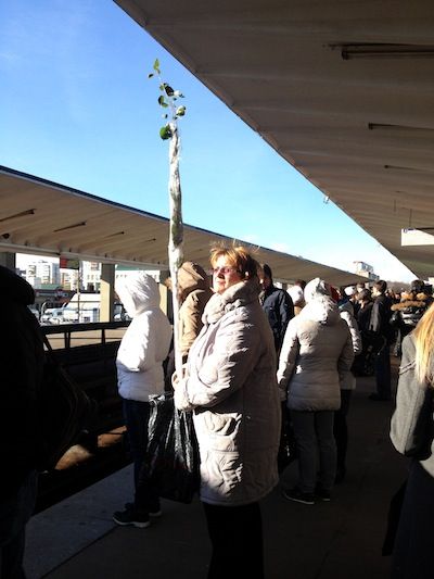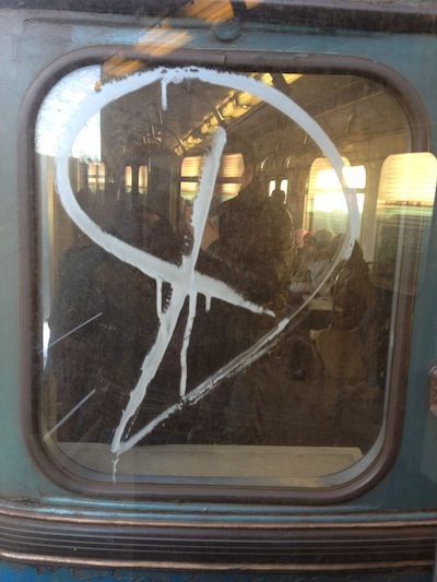 16. The sun is shining when line 7 eventually pulls out of the tunnel into the open air. Big industrial buildings are marked with the word MOKBA, as if one were likely to forget that this is still Moscow. I feel more at home amongst the Asian, Islamic and oriental faces of the working class people on this train, and on the street at Vykhino. Somehow I feel that the poor people of Russia are the most honest and sympathetic, and suddenly above my head Tolstoy and Trotsky are hovering, temporarily replacing Gogol and Dostoyevsky.